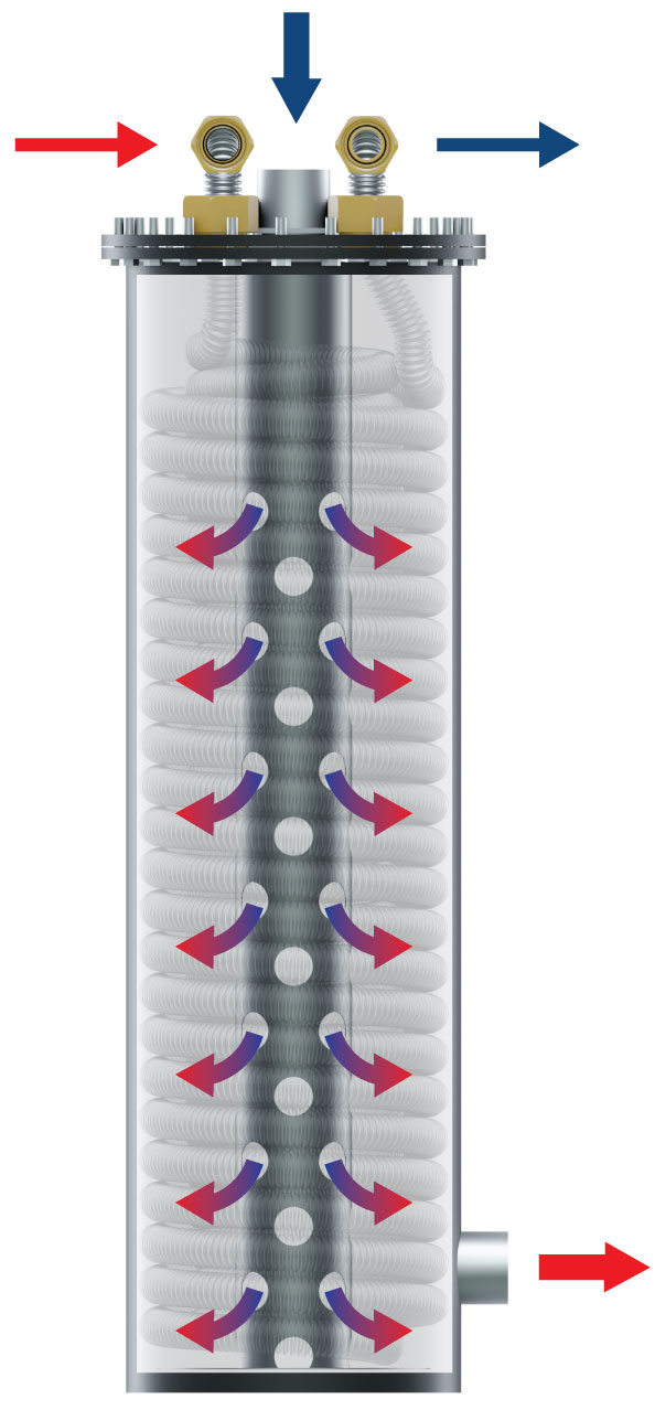 - Геометриски дизајн – Изборот на вистинскиот дијаметар на спирален калем, дијаметарот на цевката и димензиите на чекорот се клучни за перформансите на разменувачот на топлина. Како што се зголемува бројот на вртења во калемот, се зголемуваат и температурните падови на топлата течност. Зголемувањето на бројот на вртења резултираше со повисока стапка на пренос на топлина